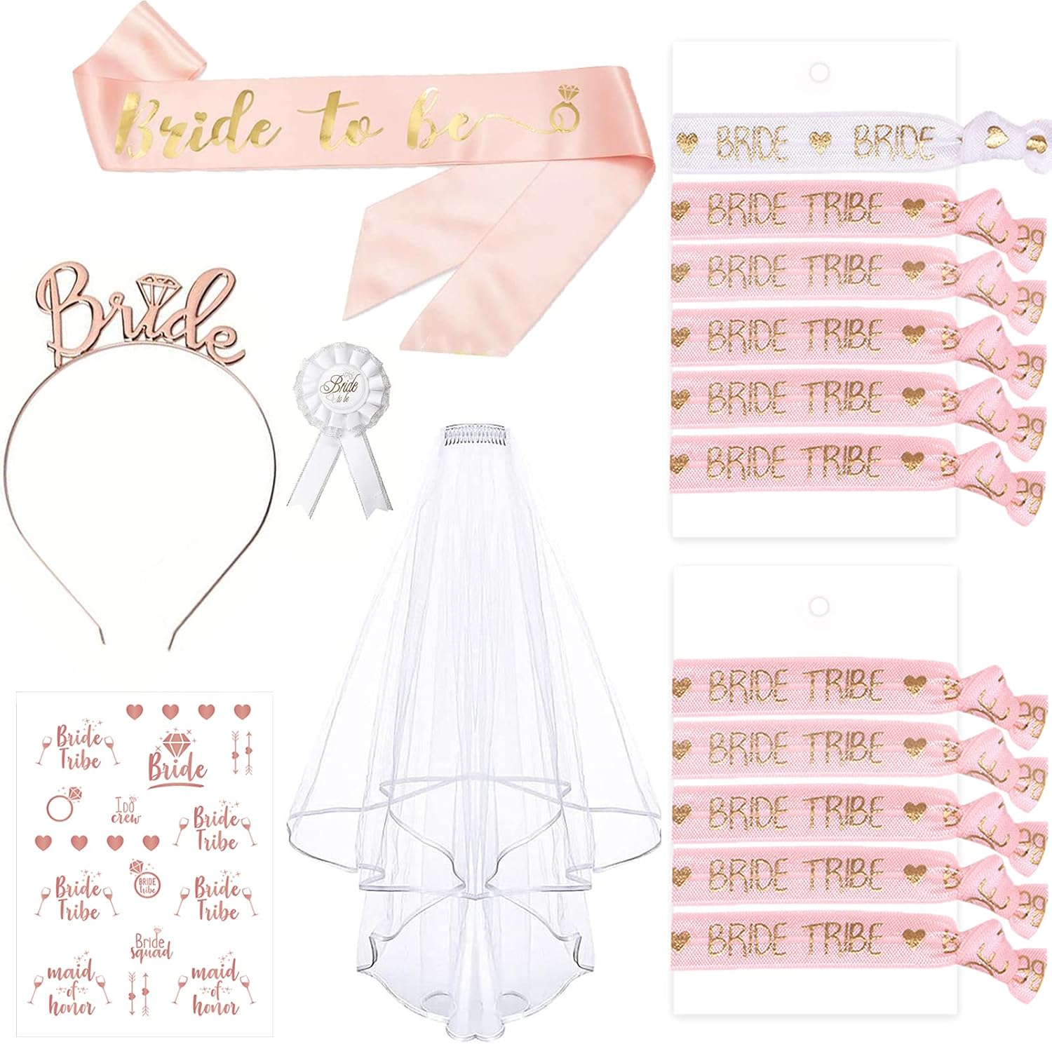 Junggesellinnenabschied Deko Armband Set,16PCS Braut to Be&Team Bride Armbänder Set mit 10 Team Braut Armbänder,1 Braut Armband,Schleier,Abzeichen,Tiara,Accessoires Frauen für Junggesellinnenabschied