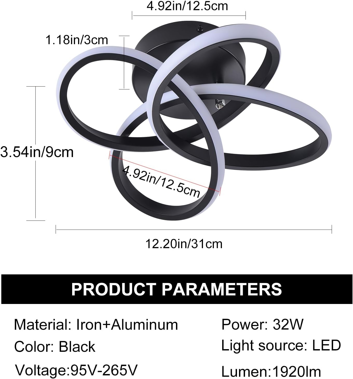 Parameter Beschreibung: Der LED Deckenleuchte Schwarz Basis ist 4.9 x1.1 in/12.5 x3cm, der Lampenkörper Durchmesser 12 in/31cm, Breite 4.9 in/12.5cm, Höhe 3.54 in/9cm. Leistung: 32 W, Spannung: 220V, Farbtemperatur: 6000K Weißlicht, mit einer Helligkeit von 1920 Lumen, empfohlener Einsatzbereich von 5-10㎡