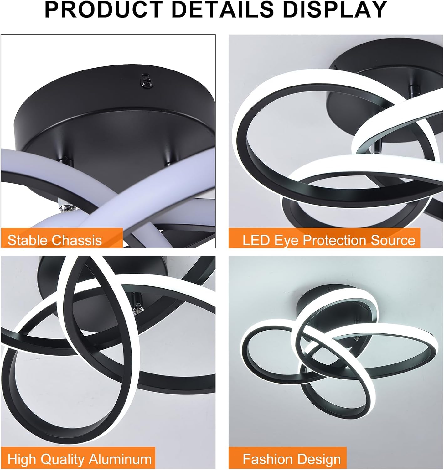 Strukturmaterial: Diese schwarze Deckenleuchte besteht aus hochwertigen Eisen- und Aluminiummaterialien. Ihr geschwungenes Design ist ein Blickfang und kann in jedem Raum eine moderne Atmosphäre schaffen. Die Eisenbasis ist stark und stabil, und das Aluminiummaterial ist lichtbeständig, kratzfest und weist eine gute Wärmeableitungsleistung auf